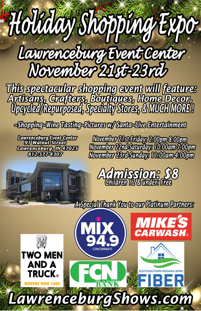You are purchasing an adult admission ticket (ages 13+) to the Holiday Shopping Expo at the Lawrenceburg Event Center. You can use this ticket as a single use admission for one of the three days.